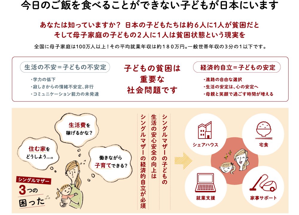「住まい・仕事・ふれあい」のあるシングルマザーハウスでママの自立をサポートし、子ども達の「孤独」をなくすこと。