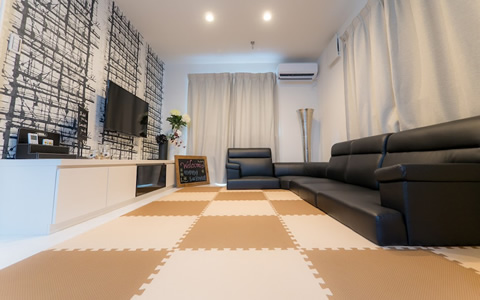 暖かい日差しが入るこのリビングは、お子さんと一緒になって楽しんだり寛いだりできるように配慮された家具や工夫がいっぱいです。